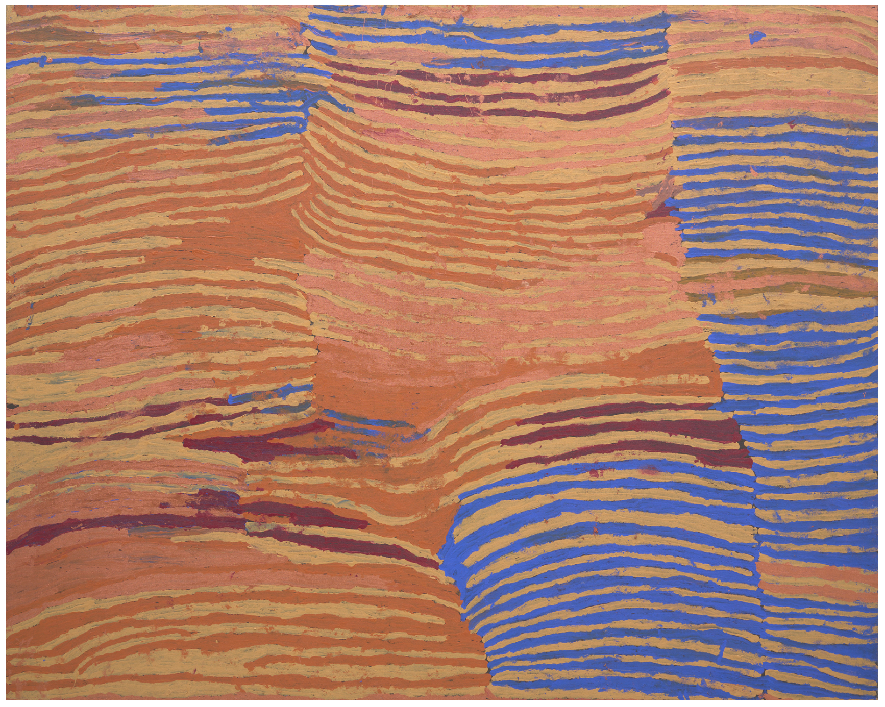 Makinti’s practice, grounded in ceremonial design and Women’s Law, redirected awareness to the aesthetics and authority of Pintupi women’s cultural narratives within Papunya Tula. Makinti refined a pictorial language that conveyed ceremonial motion as rhythm and colour, layering the canvases with paint, creating a sense of movement. This painting style is a contrast to the detailed and precise dotting that is typical of men’s traditional painting of Dreaming Law.
