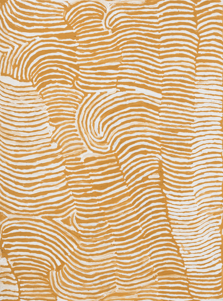 The Kungka Kutjarra narrative is significant to Makinti’s oeuvre, often entwined with sites around Lake MacDonald (Kaakuratintja) and the ceremonial rockhole of Lupulnga, over which she held custodial rights. Her paintings from the late 1990s through to the 2000s, pursue this story with increasing visual confidence. The concentric rockhole motifs from earlier works, give way to expanses of undulating lines, representing the string of the skirts worn in ceremonial dance. These flowing lines, which appear to extend beyond the edges of the canvas, create a sense of dynamism, emulating the movement of the dance. This repeated thematic focus, anchored in knowledge of the place and performed ritual, is central to Makinti’s authority as a cultural custodian, as well as to the artwork’s visual power.