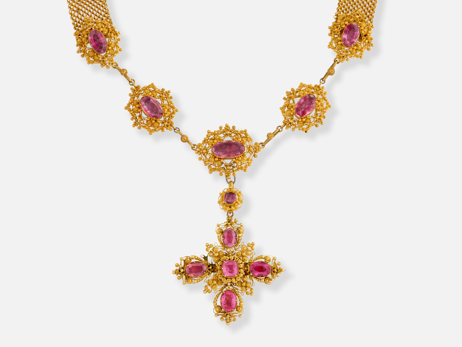 In the 19th century, glass began to occupy an increasingly important place in jewellery design. Advances in glassmaking during the Industrial Revolution made it possible to produce coloured and colourless glass of remarkable clarity and consistency, which coincided with the expansion of a consumer market eager for fashionable adornments at different price points. While glass imitations of emeralds, sapphires, and rubies were popular among the growing middle classes, even high-end jewellers recognised glass’s potential. French houses such as Bapst and later Maison Falize incorporated enamelled and pâte de verre elements into their designs.