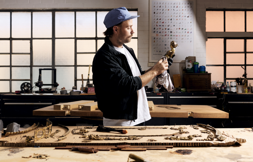 In this new series of conversations, we visit the ateliers of skilled artisans to learn more about interesting, rare trades and crafts. This issue, we chat to expert furniture restorer Jamie Neville-Young of Dealing in Design at his Melbourne studio, with music playing and his dog, Lenny, napping in the corner. Working across antique furniture, decorative arts, and modern design, his workshop is full of pieces in various stages of restoration, from an opulent Boulle piece circa 1850 to a Spade Sofa by Finn Juhl.