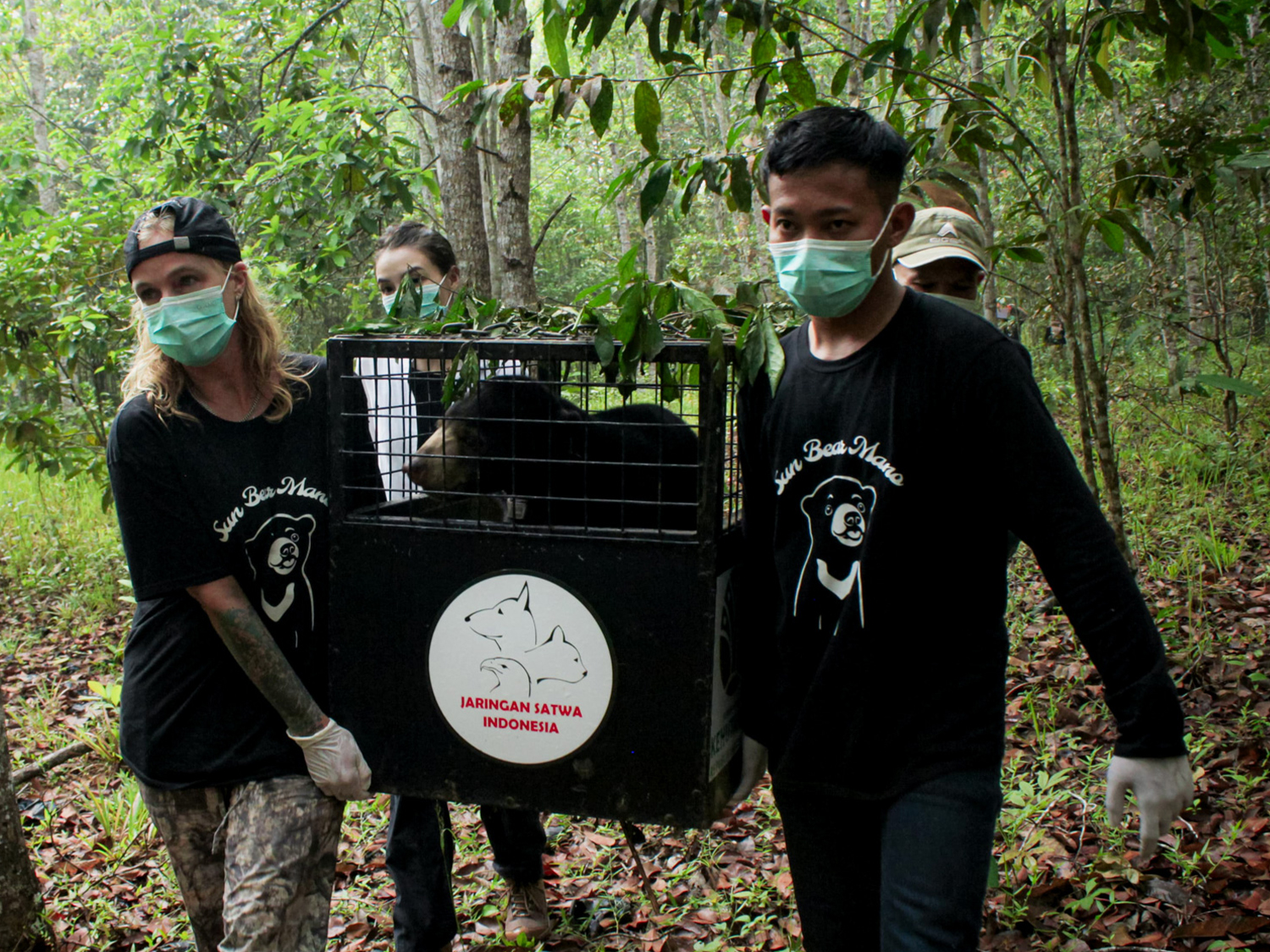 Top Image: Mano the sun bear is relocated from JAAN’s Forest School to a temporary enclosure in a release forest where she will spend the rest of her life, wild and free. Photo © JAAN