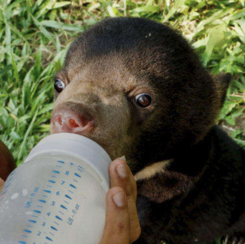 Mano the sun bear feeds from a bottle shortly after rescue. Photo © JAAN