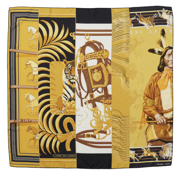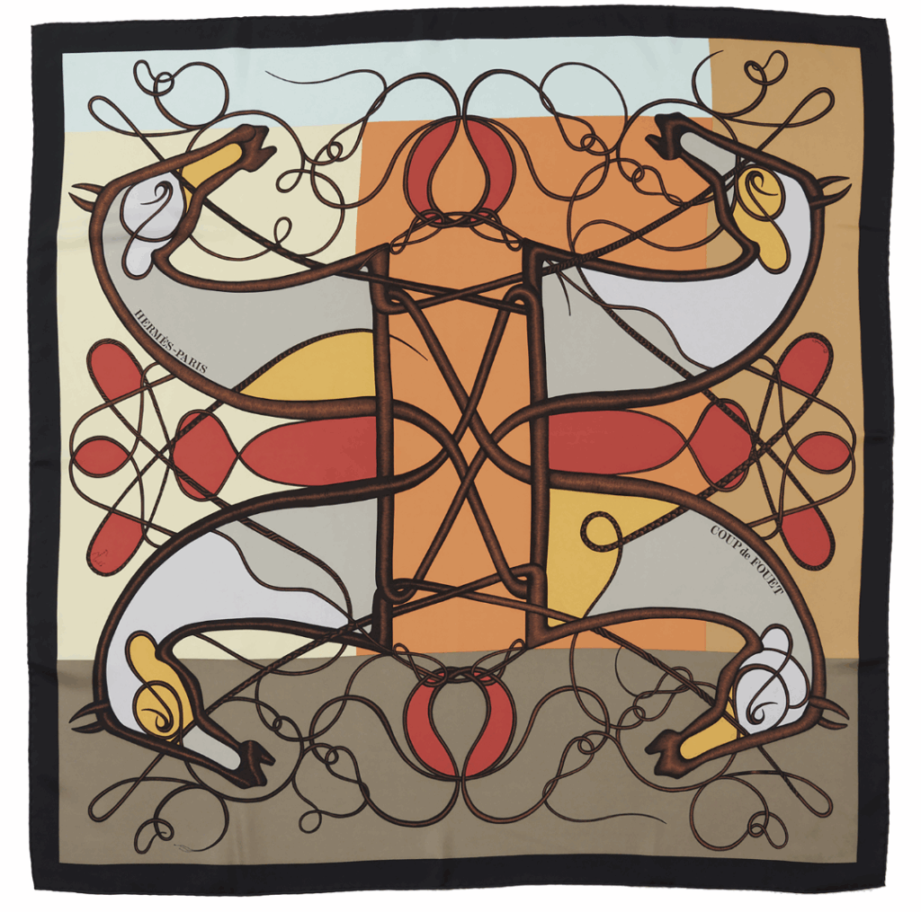 Top Image: Hermès, Silk Carré, The Coup de Fouet design by Florence Manlik, styled in silk twill of ivory, red, orange and brown, measures 90cm square. $300-500