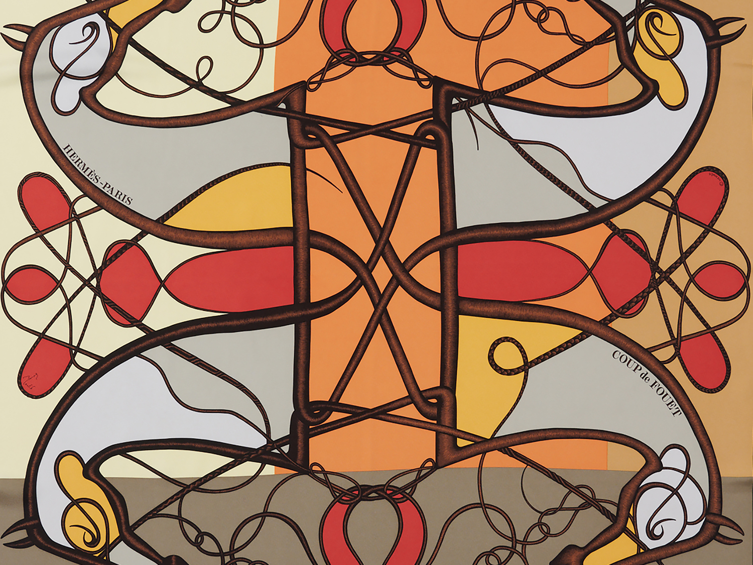 Top Image: Hermès, Silk Carré, The Coup de Fouet design by Florence Manlik, styled in silk twill of ivory, red, orange and brown, measures 90cm square. $300-500